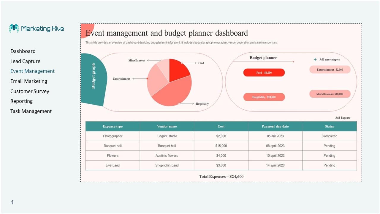 The event management feature includes comprehensive budget management tools, allowing you to plan and track your expenses effectively. This helps ensure your events stay within budget and maximize ROI.